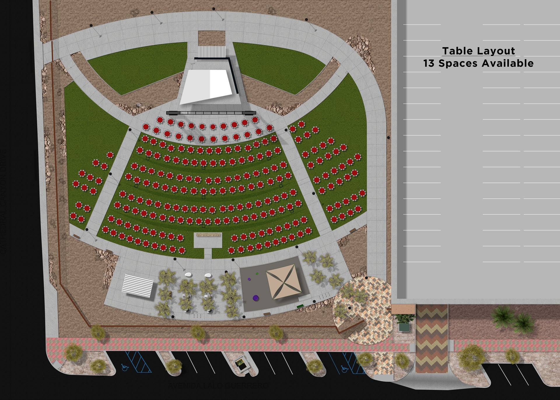 Venue & Seating Maps Following are suggested layouts for the various uses. Chair Seating Table Seating 10x10 Tents Food Trucks The site has several seating options. General Admission Assigned Seats Round Tables Picnic Table of 6 Please leave this field empty DON’T MISS A BEAT Be the first to know when something new is scheduled at the Community Amphitheater. We don’t spam! Read our privacy policyfor more info. Check your inbox or spam folder to confirm your subscription.
